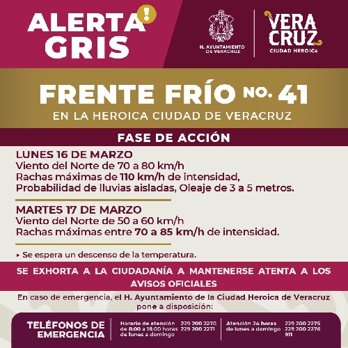 Emite PC municipal de Veracruz alerta gris por Frente Frío 41 y fuertes vientos